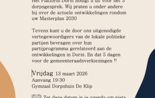 3e Dorpsgesprek programma Het Platform Dorst verwelkomt u graag bij het 3e dorpsgesprek op: Vrijdag 13 maart 2026 - Aanvang 19:30 - Gymzaal Dorpshuis De Klip Hoe gaat de bijeenkomst er uit zien: - 19.15 – 19.30 Inloop - 19.30 – 19.40 Uitleg programma en - voorstellen platform en politieke vertegenwoordigers - 19.40 – 20.00 [...]